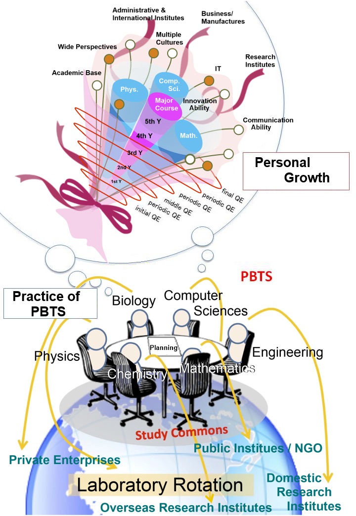 Each year, about 15 graduate students starting their master’s studies will be selected from the Division of Life Sciences and Division of Advanced Sciences. The students will pursue studies in their respective subjects while also participating in the newly established “Global Science and Engineering Sub-division.” In addition to their regular classes they will take classes for developing and strengthening innovative skills and global skills, as well as team studies for developing teamwork skills. In the team studies, each team will bring together graduate students from different fields. Each team will independently decide on a research theme, conduct research based on the specialties of the student members, and publish findings as a group. Team members may also enlist help from other graduate students who are not part of the sub-division.