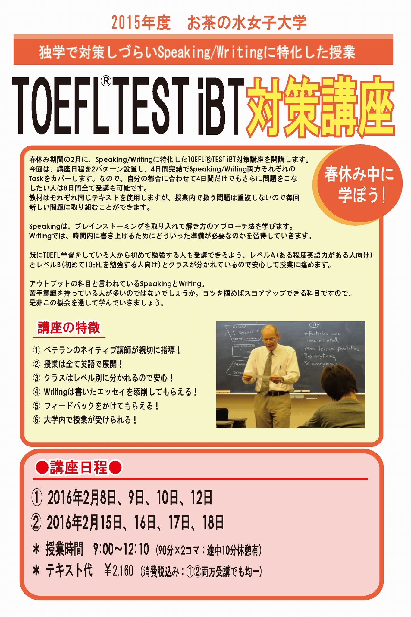 2017年春卒業予定学生(現在、学部3年生)向けのTOEFL iBT春期集中対策講座ですが、希望する学部1年生・2年生も受講できます。将来国際社会での活躍を目指す全お茶大生にお勧めします。