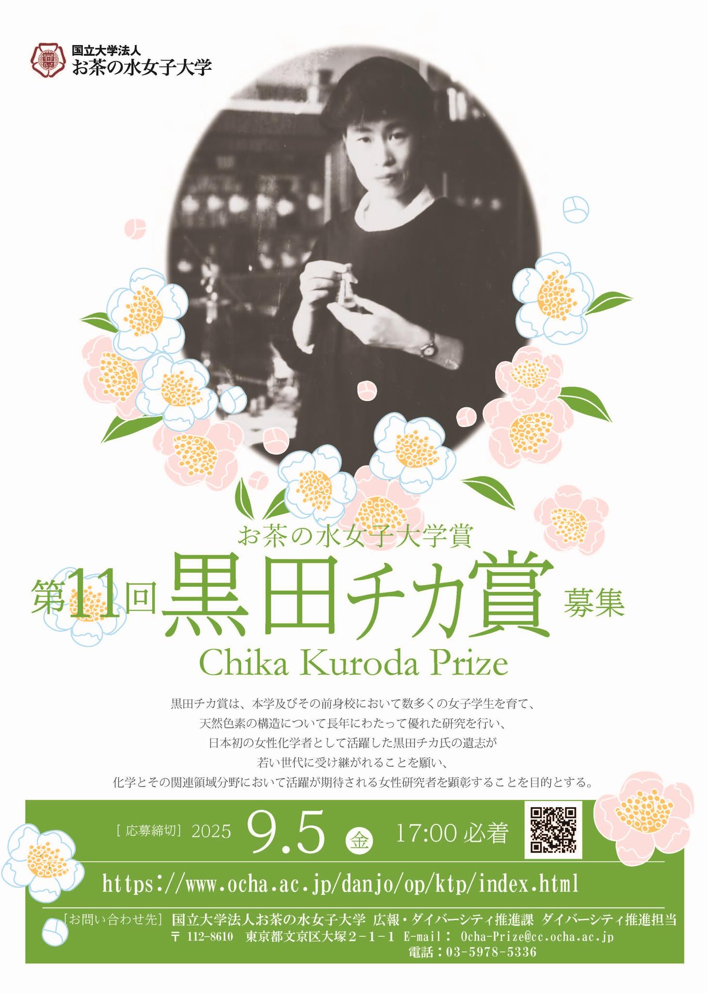 黒田チカ賞は、故前田侯子名誉教授から本学への御寄附をもとに、黒田チカ博士の日本最初の女性化学者としての自然科学研究への貢献と業績を讃えると共に、若手女性研究者の活躍を願って設立した賞で、お茶の水女子大学賞の1つとして位置付けられている。