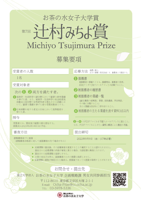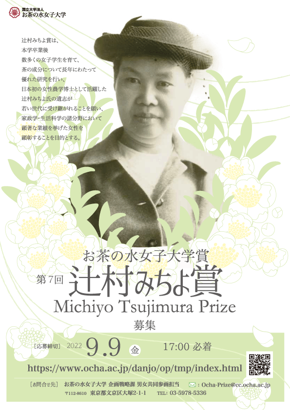 辻村みちよ賞は、本学卒業後数多くの女子学生を育て、茶の成分について長年にわたって優れた研究を行い、日本初の女性農学博士として活躍した辻村みちよ氏の遺志が若い世代に受け継がれることを願い、家政学・生活科学の諸分野において顕著な業績を挙げた女性を顕彰することを目的とする。