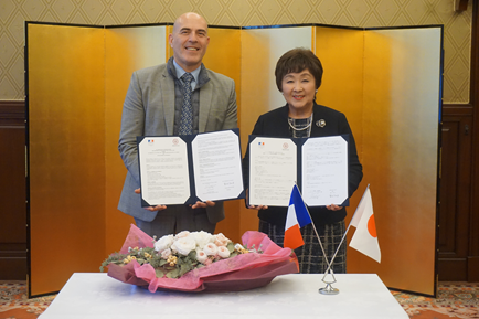 Dr. Kimiko Murofushi, president of Ochanomizu University, and Pierre Colliot, cultural counselor at the French Embassy in Japan, signed a BGF Partner agreement for a joint scholarship program on March 1.