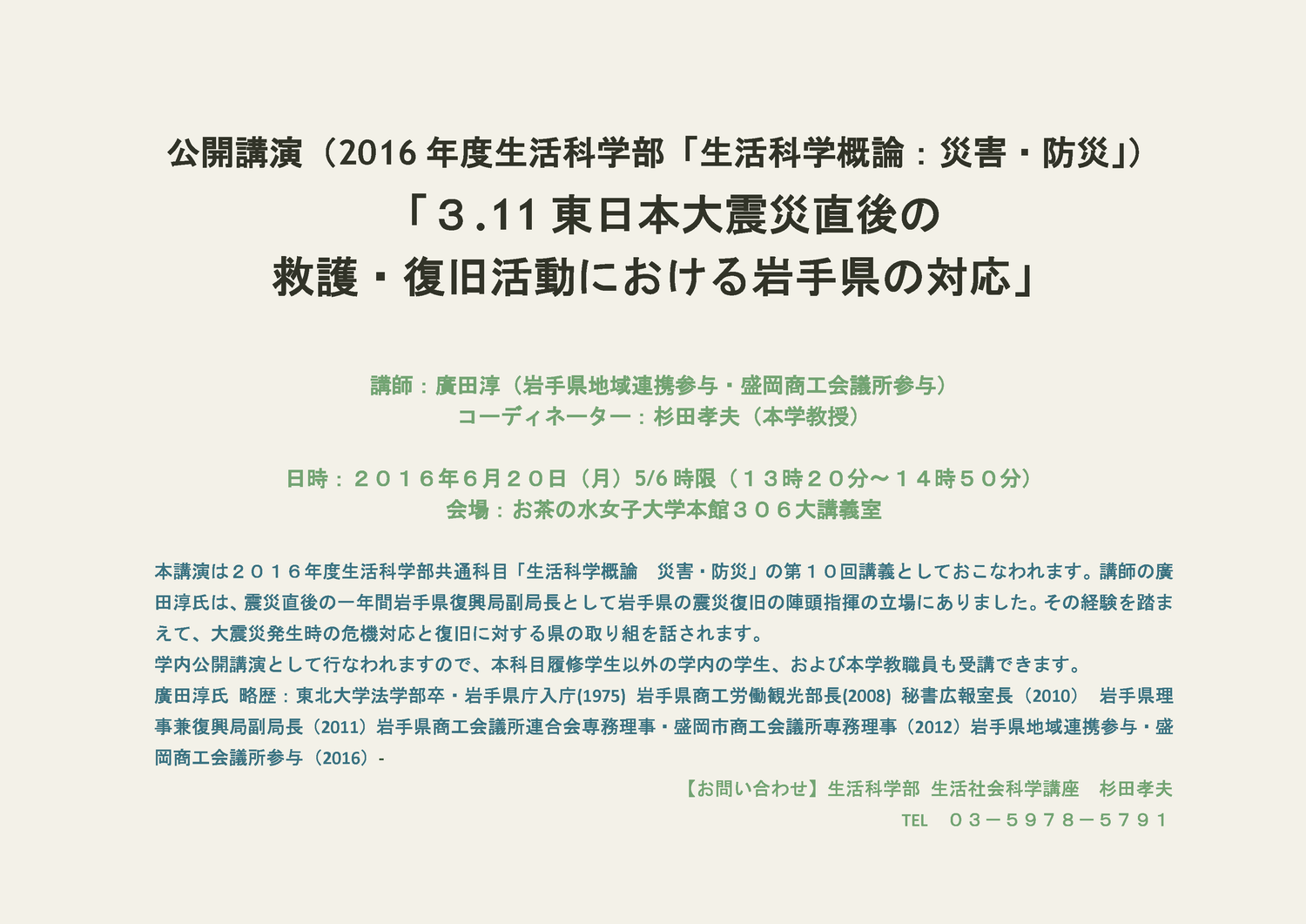 本講演は2016年度生活科学部共通科目「生活科学概論 災害・防災」の第10回講義としておこなわれます。