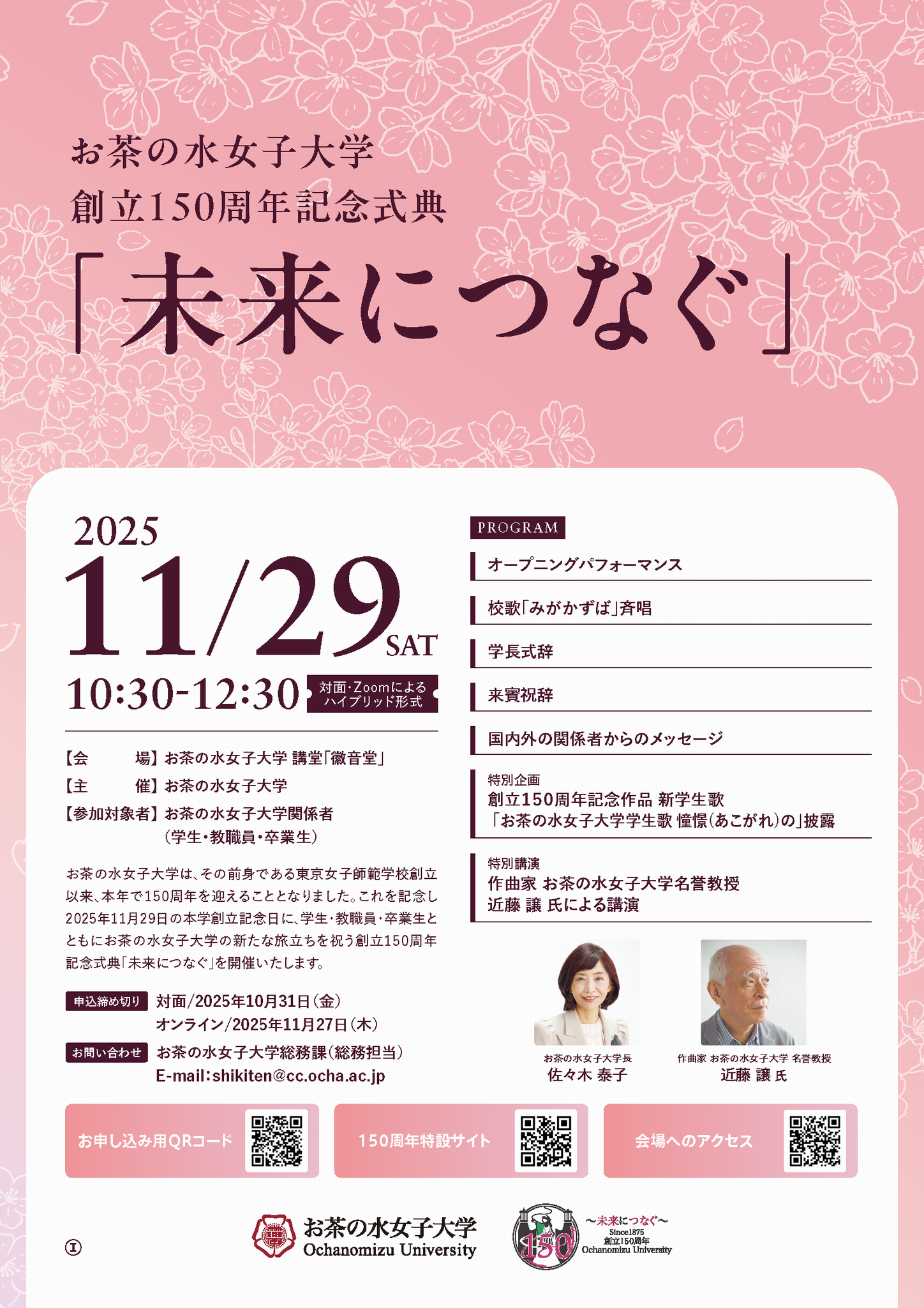 これを記念し2025年11月29日の本学創立記念日に、学生・教職員・卒業生とともにお茶の水女子大学の新たな旅立ちを祝う創立150周年記念式典「未来につなぐ」を開催いたします。