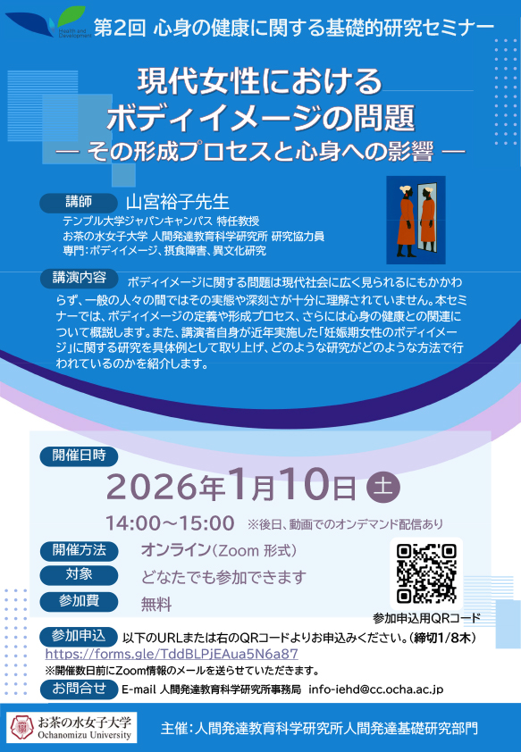 ボディイメージに関する問題は現代社会に広く見られるにもかかわらず、一般の人々の間ではその実態や深刻さが十分に理解されていません。本セミナーでは、ボディイメージの定義や形成プロセス、さらには心身の健康との関連について概説します。また、講演者自身が近年実施した「妊娠期女性のボディイメージ」に関する研究を具体例として取り上げ、どのような研究がどのような方法で行われているのかを紹介します。
