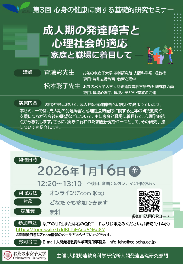 現代社会において、成人期の発達障害への関心が高まっています。本セミナーでは、成人期の発達障害と心理社会的適応に関する近年の研究動向や支援につながる今後の展望などについて、主に家庭と職場に着目して、心理学的視点から検討します。さらに、実際に行われた調査研究をベースとして、その研究手法についても紹介します。