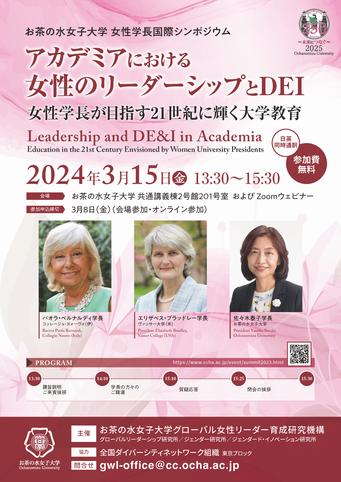 To overcome this phenomenon, Ochanomizu University welcomes women presidents/rectors from overseas partner universities to discuss women's leadership in academia. An international symposium, entitled “Leadership and DE&I in Academia: Education in the 21st Century Envisioned by Women University Presidents,” will be held at Ochanomizu University on March 15, 2024. This symposium features speeches by the respective presidents/rectors about leadership and college education based on diversity, equity and inclusion (DE&I).