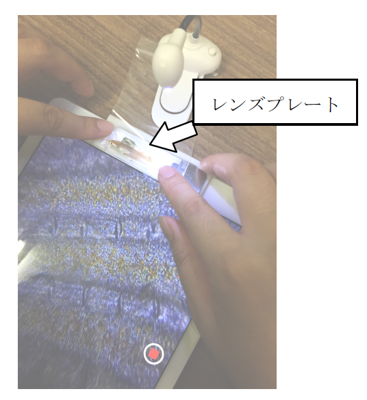 タブレット顕微鏡とは前面側カメラ上に市販の小型レンズプレートを載せ、その上に観察試料を置くことで、画面を通して約100倍程度の観察が可能になる新しい手法の顕微鏡です。