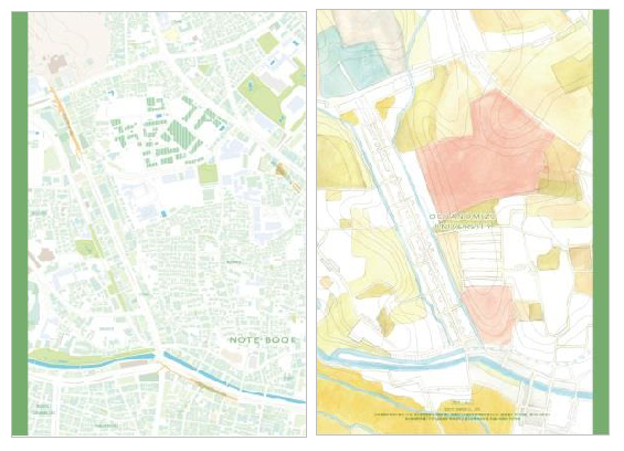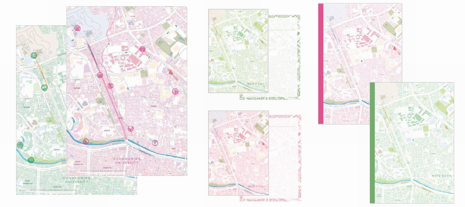商品ラインナップは、お茶の水女子大学がある東京都文京区大塚周辺の地図をデザインしたクリアファイル、ノート、メモパッドの3アイテムが各2種類の計6種類。「地理女子」が、お茶大生や地域住民に大学周辺をもっと知って、親しんでほしいとの思いで企画し、日頃より研究に取り組む地理学の観点から、大学周辺の現代と過去それぞれの『地理的スポット紹介』や、『段彩図(※1)』などを選びました。ゼンリンは、地図ステーショナリー「mati mati」の企画・販売など、「地図を新たなコンセプトで捉え市場創造」を掲げた事業展開を進めており、今回も「mati mati」で培ったノウハウを活かし、商品づくりやデザインなど、商品化を全面サポートしました。約6か月の期間に複数回のミーティングを行い、様々なアイデアを出し合って企画しました。