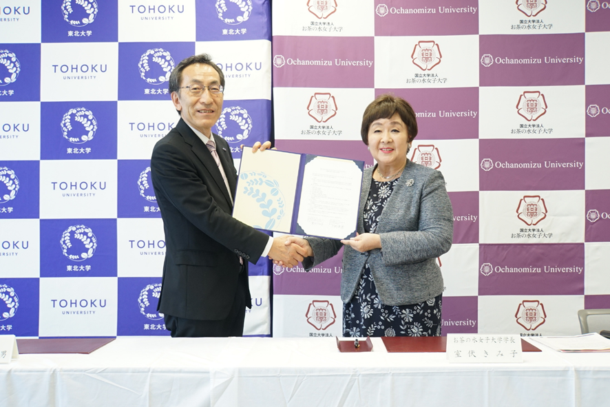 お茶の水女子大学と東北大学は、7月19日(金)に、AI・数理・データリテラシー教育、グローバル女性リーダー育成、ダイバーシティの推進等を目的に、お互いの強みをもって協力体制を構築、クロスアポイントメントを活用した研究力強化、研究拠点形成、研究成果の社会実装、協働人材育成などを内容とした包括連携協定を締結いたしました。