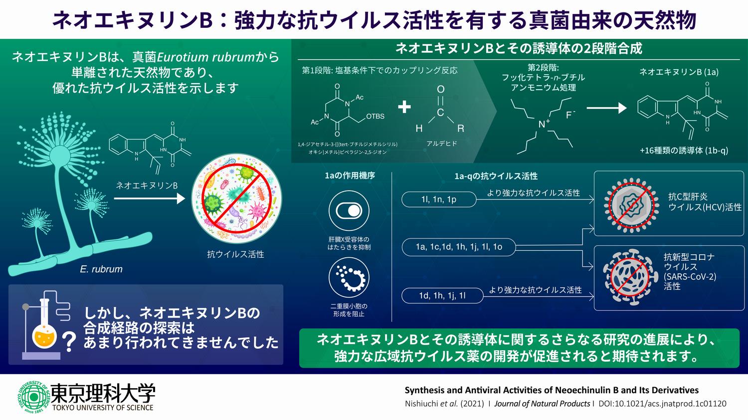 東京理科大学理工学部応用生物科学科の倉持幸司教授、友重秀介助教(現:東北大学 大学院生命科学研究科)、大金賢司助教(現:お茶の水女子大学 基幹研究院自然科学系/理学部化学科)、国立感染症研究所治療薬・ワクチン開発研究センターの渡士幸一 治療薬開発総括研究官(兼任:東京理科大学大学院 理工学研究科応用生物科学専攻 客員教授)、大橋啓史博士、麻布大学獣医学部/ヒトと動物の共生科学センターの紙透伸治准教授らの研究グループは、ネオエキヌリンBと16種の誘導体(うち15種は新規化合物)の合成および合成法の確立に成功しました。また、これらの化合物の多くが、C型肝炎ウイルス(HCV)または新型コロナウイルス(SARS-CoV-2)に対して抗ウイルス活性を示すことを実証しました。本研究を発展させることで、様々なウイルスに対して有効な抗ウイルス剤開発への貢献が期待されます。