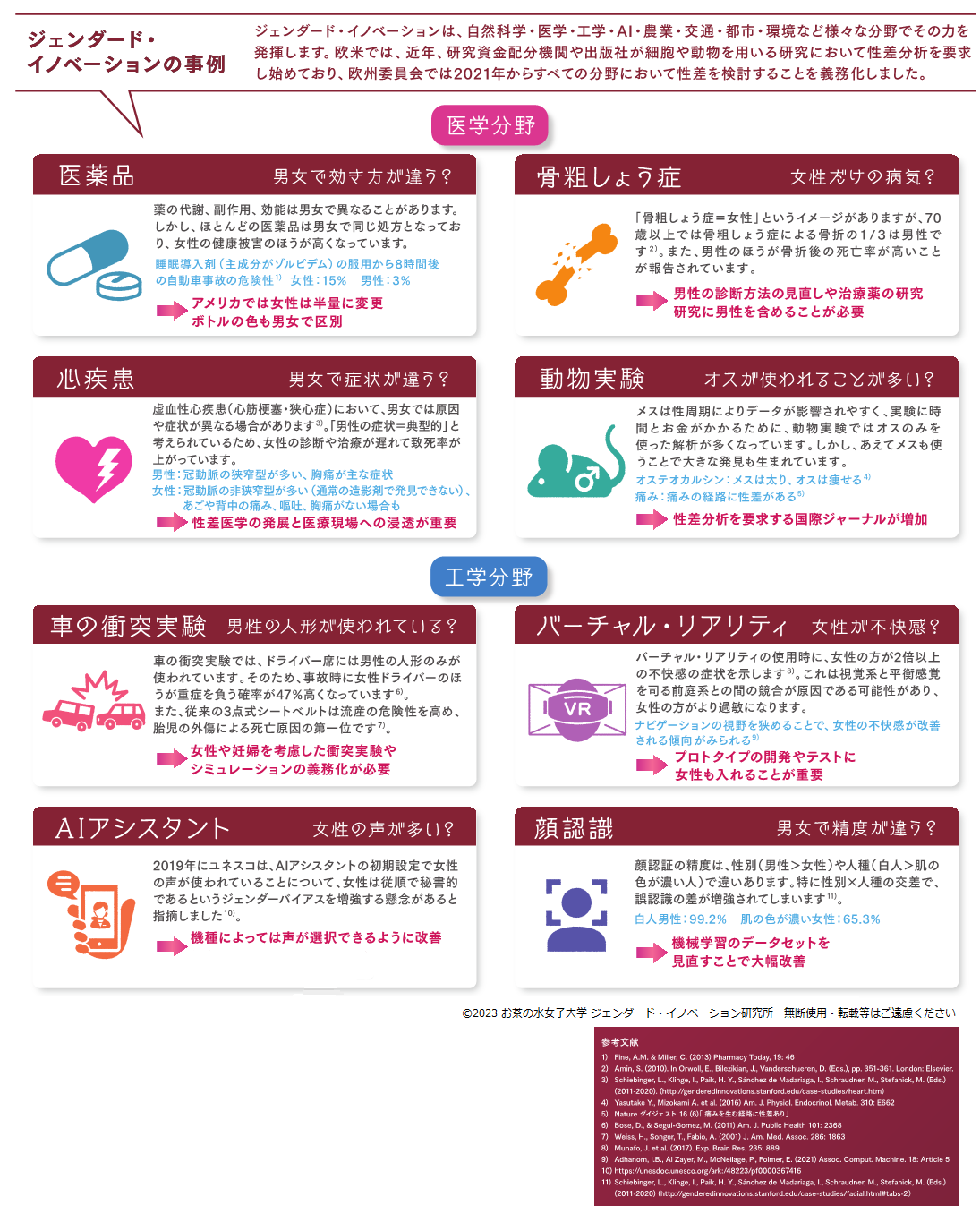 ジェンダード・イノベーションとは、性差(セックスとジェンダー)を考慮して研究を行うことでイノベーションを創出し社会実装へつなげようという概念です。これまで見過ごされてきた生物学的及び社会学的性別の性差を考慮した研究から得られる成果に基づき、未来社会に適合した生活者向けの製品やサービスの開発と提供が可能になることが期待されています。