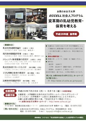 平成26年度も引き続き「変革期の乳幼児教育・保育を考える」を主題として、ECCELL社会人プログラムを実施いたします。社会人受講生は科目等履修生として登録され、一定の条件を満たせば生活科学部で単位が認定されます。多くの方々のご応募をお待ちしております。(旧アップリカ特設講座で単位を取得された社会人受講生の方も、科目内容が異なりますので全科目受講可能です。)