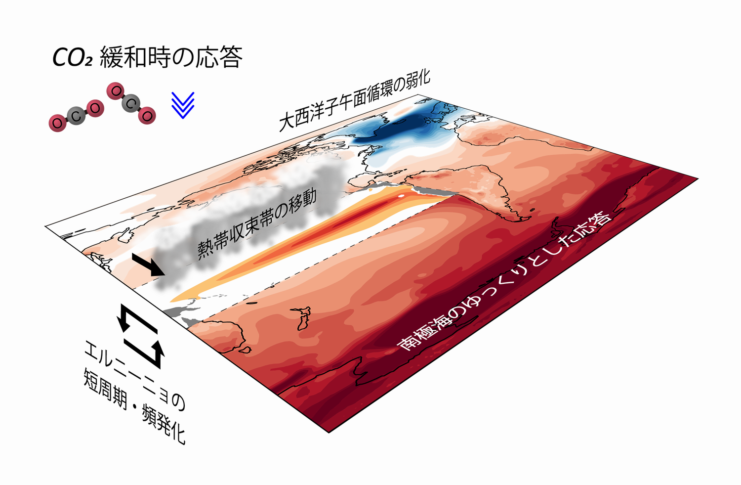 陰影はCO2緩和期間と増加期間の地表気温の差。北大西洋では大西洋子午面循環が弱化することで気温がより低く、南極海では温暖化の緩和速度が遅いことで昇温が残る。両極の気温コントラストにより熱帯収束帯が暖かい南側にシフトする。熱帯収束帯とエルニーニョの相互作用によりエルニーニョが頻発化する。
