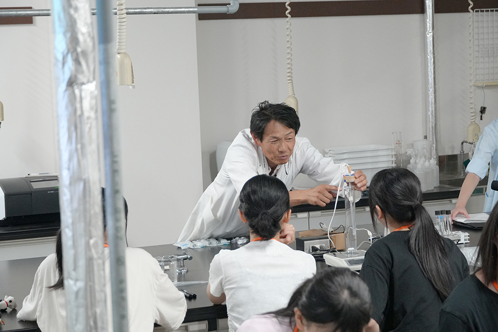 お茶の水女子大学大瀧雅寛教授による「水を透明にするには~水の高度浄水処理~」では、参加者たちがグループに分かれ、高校の授業では使ったことのない実験器具を用いるなどして、浄水処理に挑戦しました。参加者たちは、初めて手に取る実験器具に目を輝かせ、使い方を真剣に聞き丁寧に扱いながら実験を行う様子が見られました。