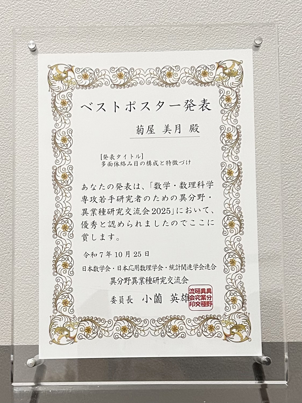 理学専攻博士後期課程数学領域 1年 小川実里さんと理学専攻博士前期課程数学コース 2年 菊屋美月さんが、日本数学会・日本応用数理学会・統計関連学会連合が2025年10月25日に開催した「異分野異業種研究交流会2025」において、ベストポスター発表を受賞しました。