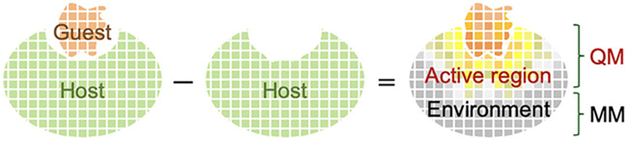 巨大分子全体(ホスト-ゲスト複合系とホスト系)に領域分割法に基づく半経験 QM 計算を適用することで、電子状態応答を迅速に評価し QM/MM 境界を定量的に定義できる。