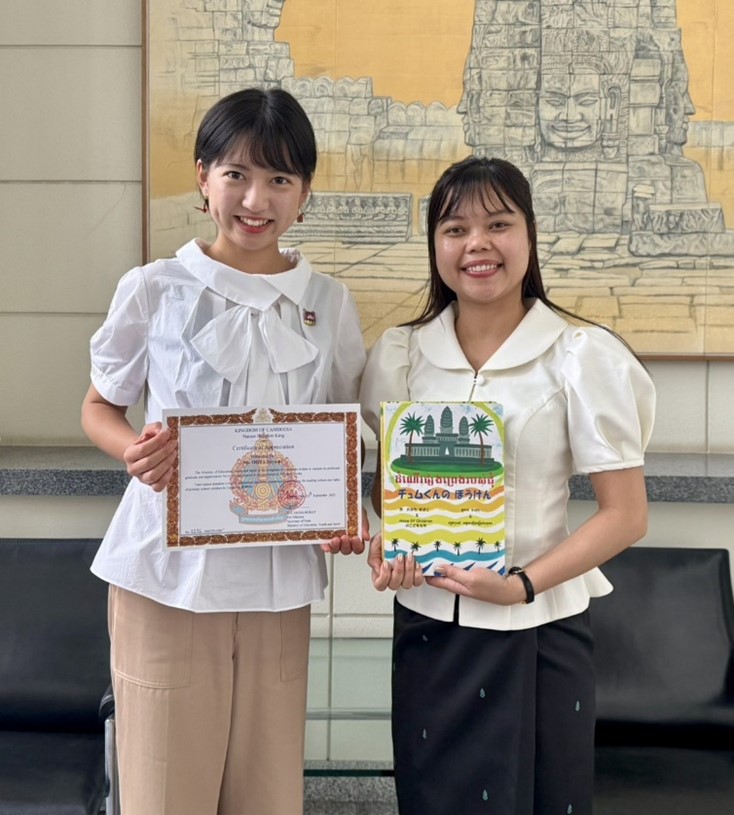 人間文化創成科学研究科人間発達科学専攻教育科学コース2年の太田朝弓さんが、2025年10月10日に、在カンボジア日本大使館でカンボジア教育省初等教育局に自主制作の350冊の絵本を寄贈し、同省から感謝状を受け取りました。