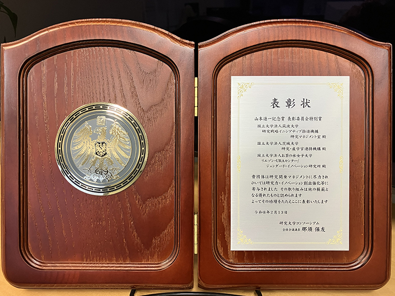 文部科学省「世界で活躍できる研究者戦略育成事業」において、本学が代表機関を務める「大学×国研×企業連携によるトップランナー育成プログラム(TRiSTAR)」を推進してきた、筑波大学、茨城大学、お茶の水女子大学のURA(※)を中心とするチームが、第二回山本進一記念賞「表彰委員会特別賞」を受賞しました(2026年2月13日)。