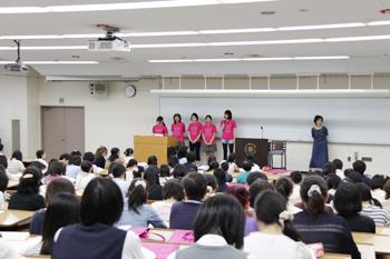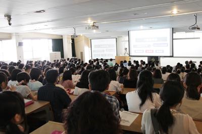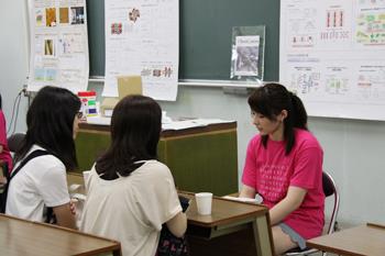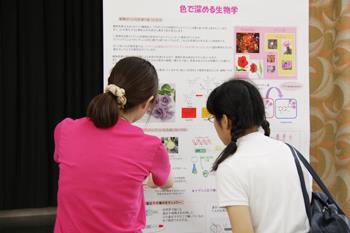全体説明会後には、各学科・講座・コース別に、模擬授業や在学生による相談、研究室ツアーなど工夫を凝らしたプラグラムが用意され、ピンクのTシャツを着た学生が大活躍。どのプログラムも大盛況で、参加者から活発な質問が飛び交っていました。