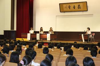 全体説明会では、羽入佐和子学長から躍進するお茶大の紹介と受験生へのメッセージ、続いて耳塚寛明教育機構長から多様な入試制度、お茶大の特徴的な教育プログラムである「複数プログラム選択履修制度」や「文理融合リベラルアーツ教育」、本学独自の奨学金、学生寮などについての説明がありました。その後、学部長による学部・学科の説明があり、皆さん熱心に耳を傾けていました。