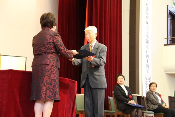 記念式典は、文部科学省事務次官をはじめ各界から多くの来賓を迎え、伝統の息づく徽音堂で厳粛に執り行われました。式典では、 遠山敦子氏、中谷陽一氏、Marie-Claire LETT氏に名誉博士称号が授与され、本学元学長、名誉教授の本田和子氏による「140年のあゆみを振り返る」と題する特別講演も行われました。